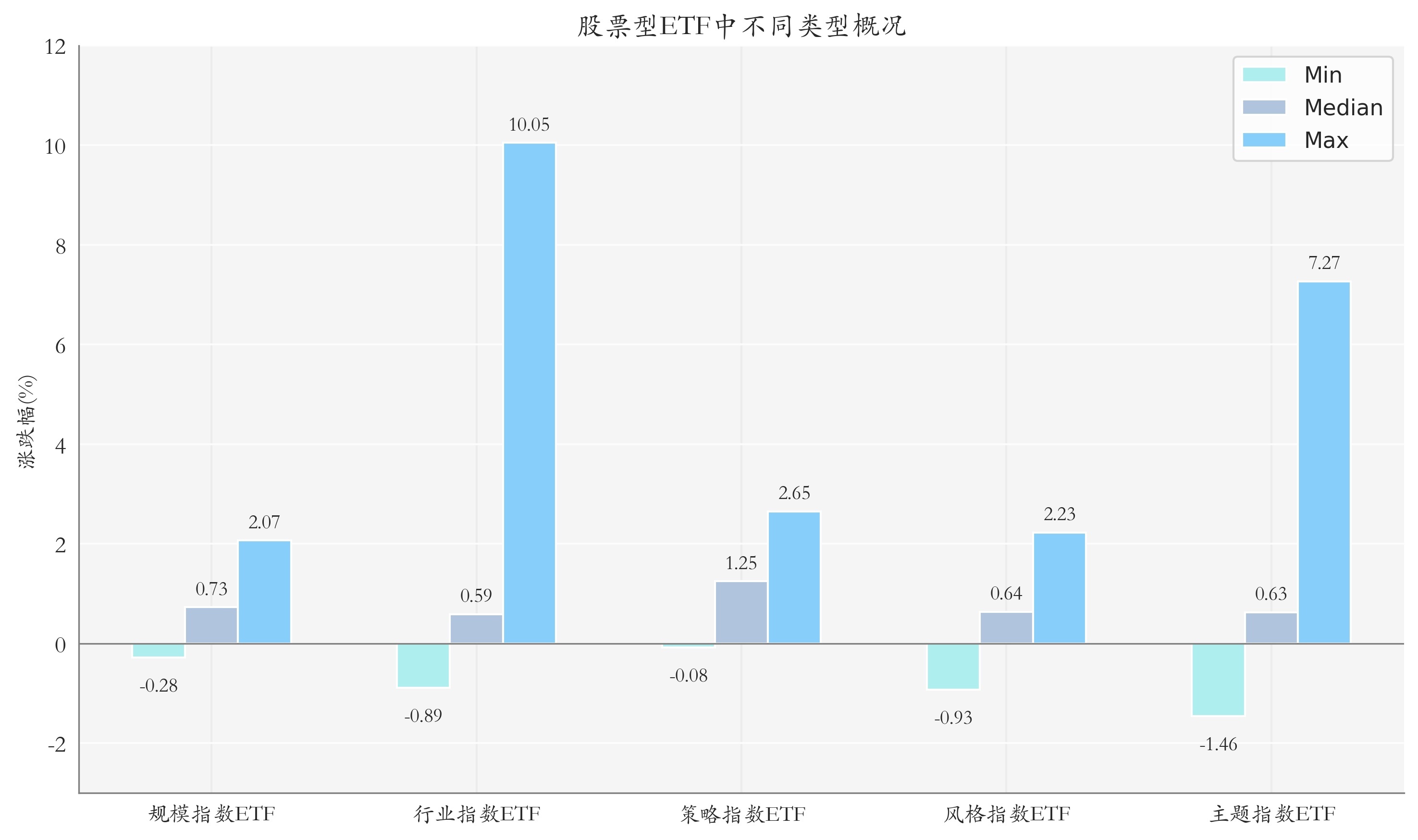 昨日股票型ETF收益率中位数为0.72%。其中按照不同分类,规模指数ETF中鹏华中证800自由现金流ETF收益率最高,为2.07%;行业指数ETF中富国中证全指建筑材料ETF收益率最高,为10.05%;策略指数ETF中广发中证国新央企股东回报ETF收益率最高,为2.65%;风格指数ETF中建信上证智选科创板创新价值ETF收益率最高,为2.23%;主题指数ETF中华夏中证基建ETF收益率最高,为7.27%。