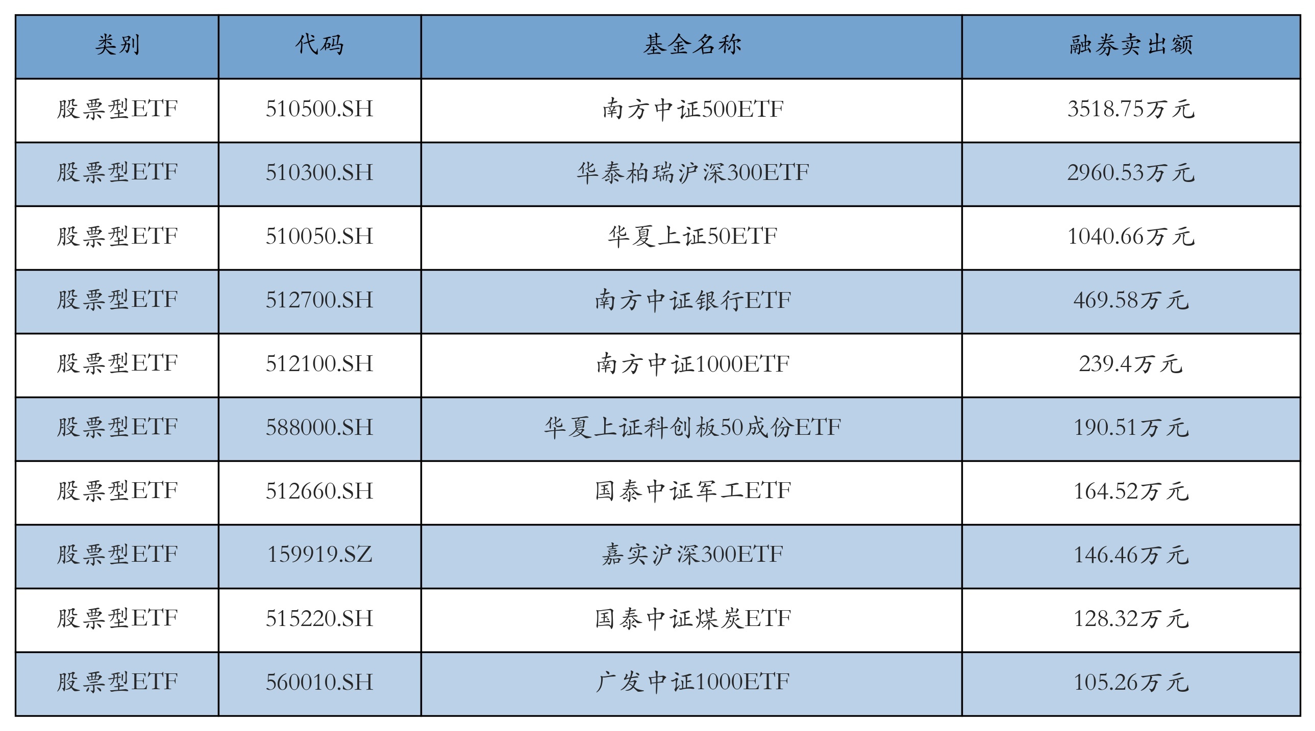 昨日股票型ETF融资卖出额最高的3只ETF及其卖出金额分别为:南方中证500ETF(3518.75万元)、华泰柏瑞沪深300ETF(2960.53万元)、华夏上证50ETF(1040.66万元)。融券卖出额前10详情见下表: