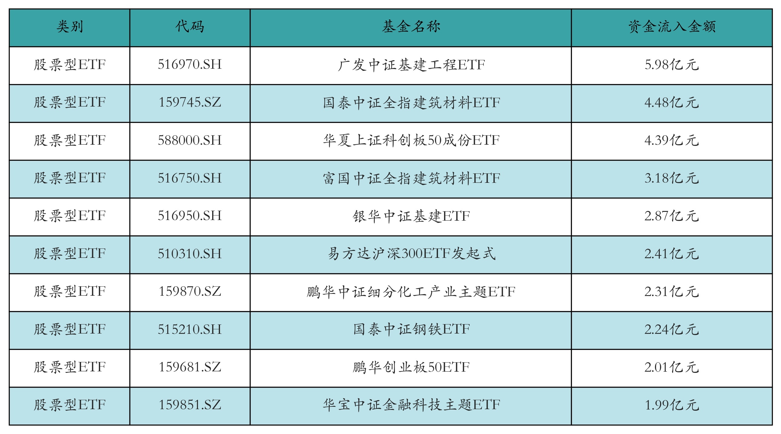 昨日股票型ETF资金流入最多的3只ETF及其流入金额分别为:广发中证基建工程ETF(流入5.98亿元)、国泰中证全指建筑材料ETF(流入4.48亿元)、华夏上证科创板50成份ETF(流入4.39亿元)。资金流入前10详情见下表: