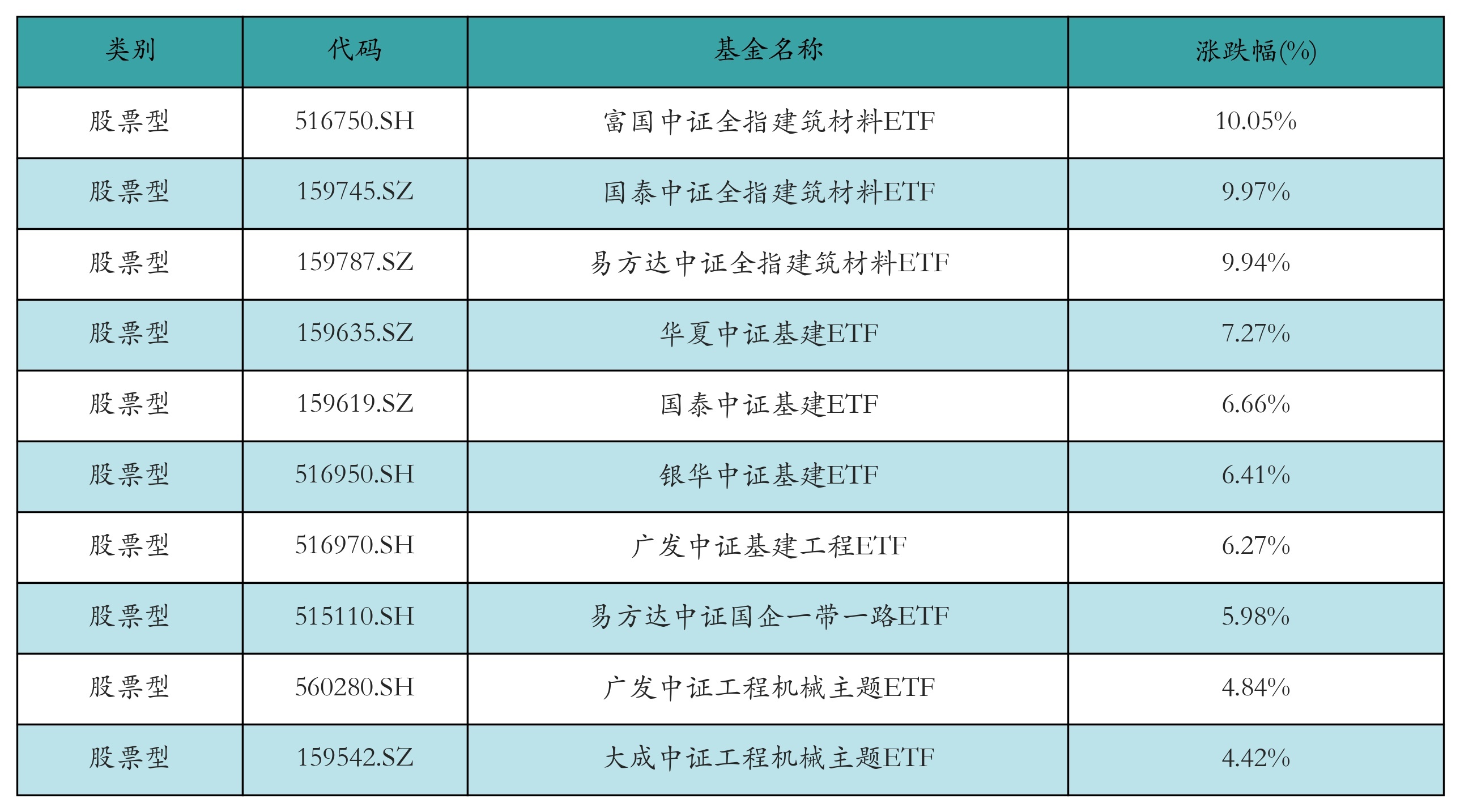 昨日股票型ETF涨幅最高的3只ETF及其收益率分别为:富国中证全指建筑材料ETF(10.05%)、国泰中证全指建筑材料ETF(9.97%)、易方达中证全指建筑材料ETF(9.94%)。涨幅前10详情见下表: