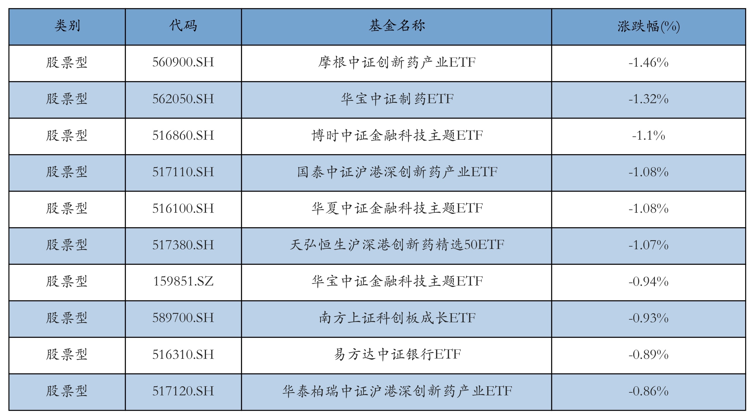昨日股票型ETF跌幅最大的3只ETF及其收益率分别为:摩根中证创新药产业ETF(-1.46%)、华宝中证制药ETF(-1.32%)、博时中证金融科技主题ETF(-1.1%)。跌幅前10详情见下表: