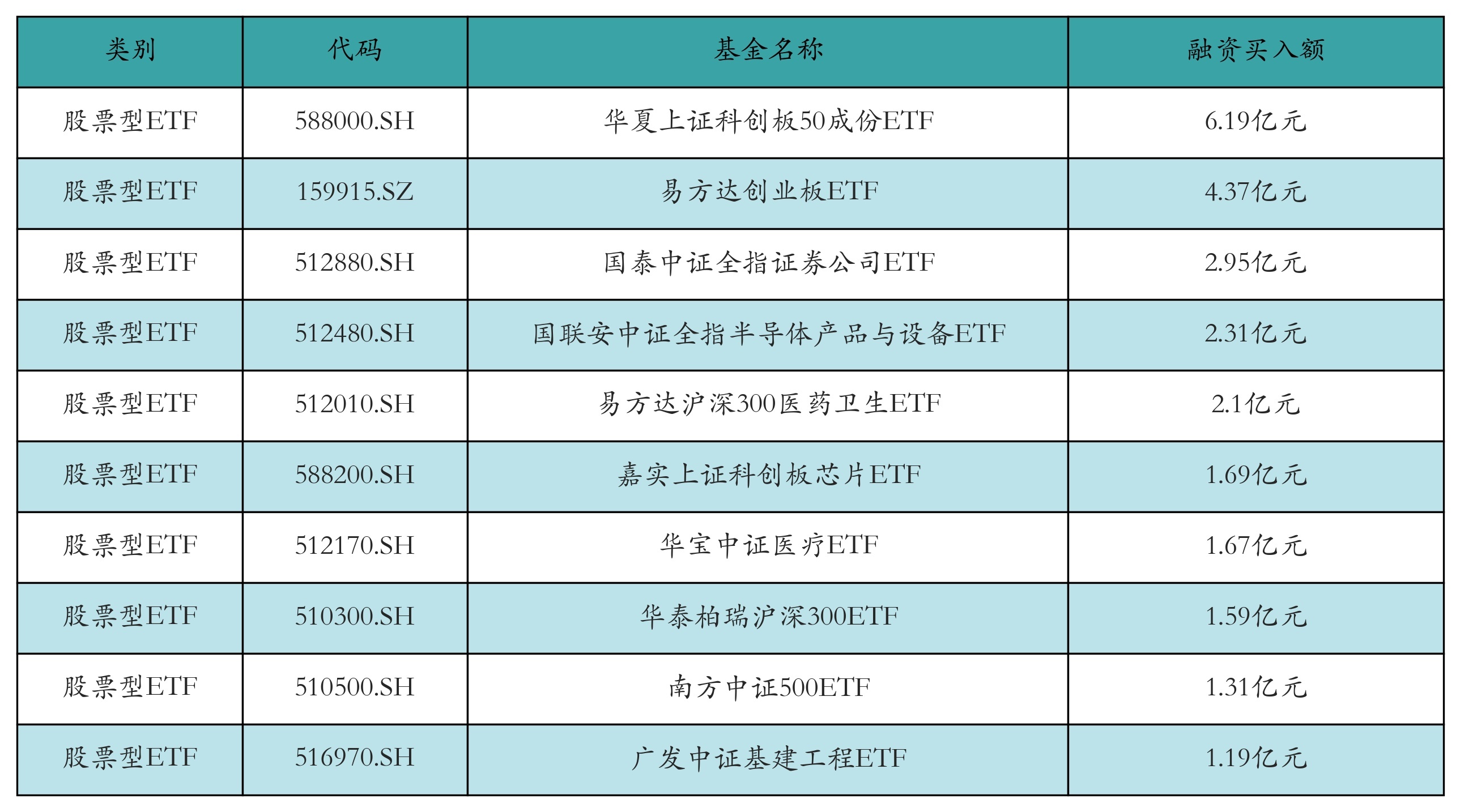 昨日股票型ETF融资买入额最高的3只ETF及其买入金额分别为:华夏上证科创板50成份ETF(6.19亿元)、易方达创业板ETF(4.37亿元)、国泰中证全指证券公司ETF(2.95亿元)。融资买入额前10详情见下表: