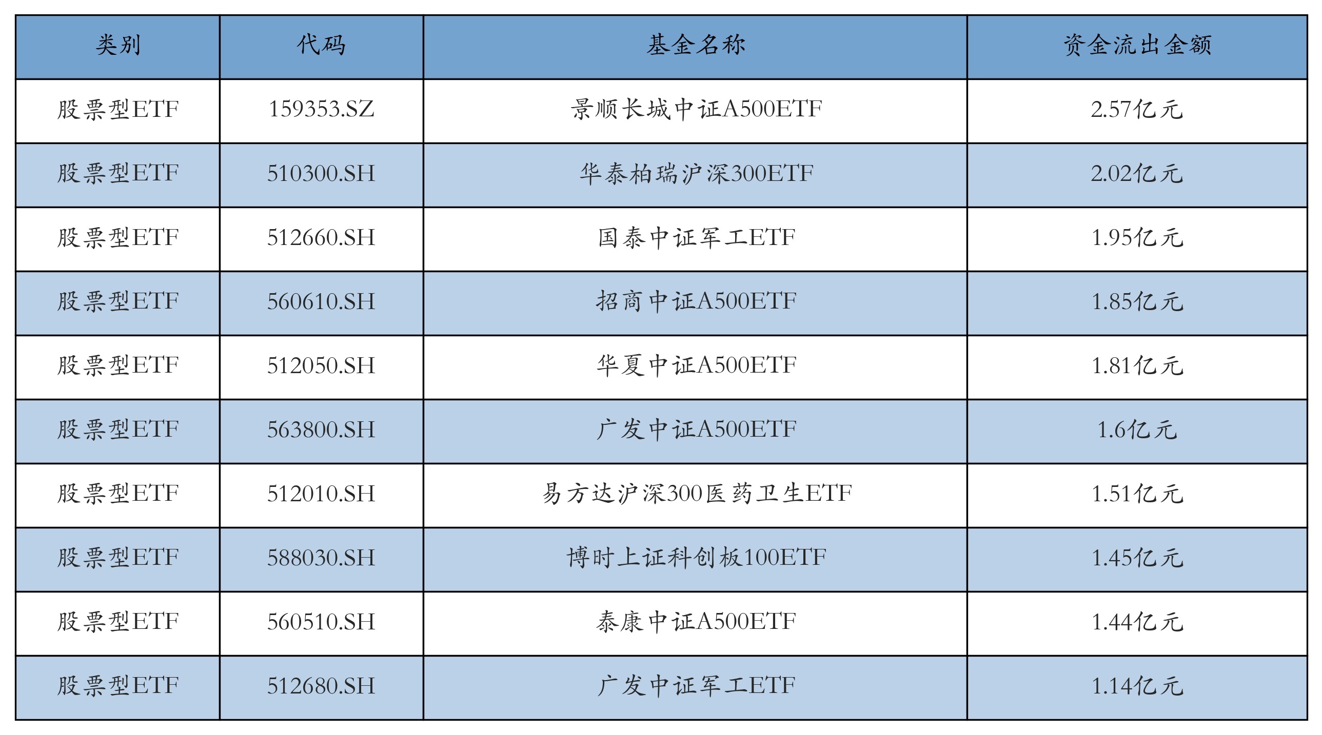 昨日股票型ETF资金流出最多的3只ETF及其流出金额分别为:景顺长城中证A500ETF(流出2.57亿元)、华泰柏瑞沪深300ETF(流出2.02亿元)、国泰中证军工ETF(流出1.95亿元)。资金流出前10详情见下表: