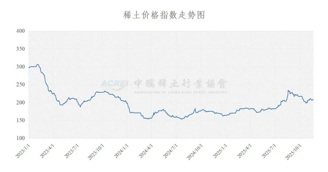 今日价格指数:208.6指数计算:稀土价格指数是由基期和报告期的交易数据计算组成,基期选用2010年全年的交易数据,报告期选用全国20多家稀土企业每天实时交易数据的平均值,代入稀土指数价格模型计算得出。(基期指数为100)